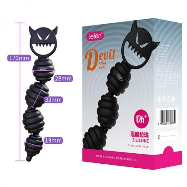 Анальная цепочка выполнена из 4 рельефных шариков различного диаметра, начиная с наименьшего, что идеально для комфортного введения! Кольцо в основании, выполненное в виде мордочки дьяволенка, позволяет совершать возвратно-поступательные движения!
