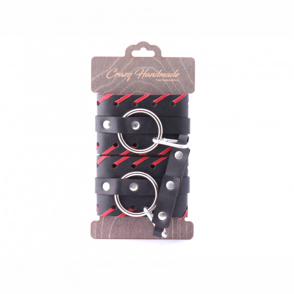 Выполнены оковы из натуральной кожи в черном цвете и декорированы красной плетеной окантовкой и металлическими клепками